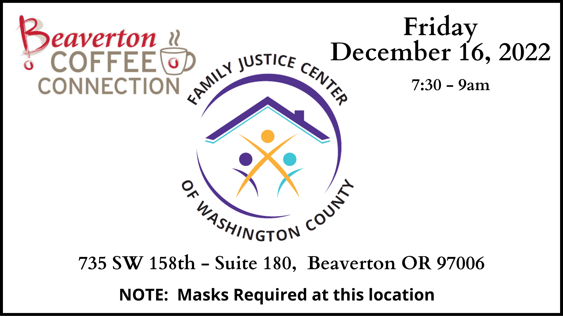 Join us for Coffee Connection! Family Justice Center of Washington County, 735 SW 158th, Suite 180, Beaverton OR 97006*7:30 Informal Networking 8:00 Meet our Host