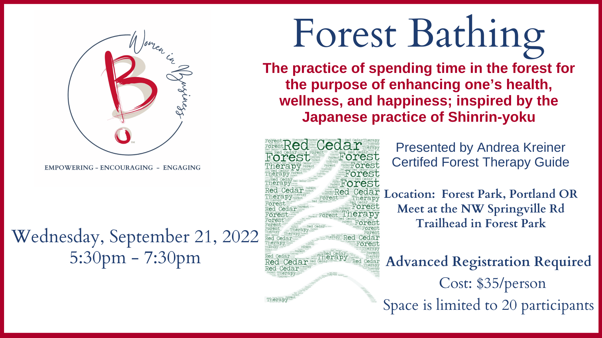 Our Forest Bathing event will be a 2 hour slow and mindful sensory journey, with time spent both in slow walking and stillness (or sitting). The guide will offer a series of invitations to help participants slow down, engage their senses, release stress, and be more present while they connect with the natural world and experience the restorative qualities of nature.