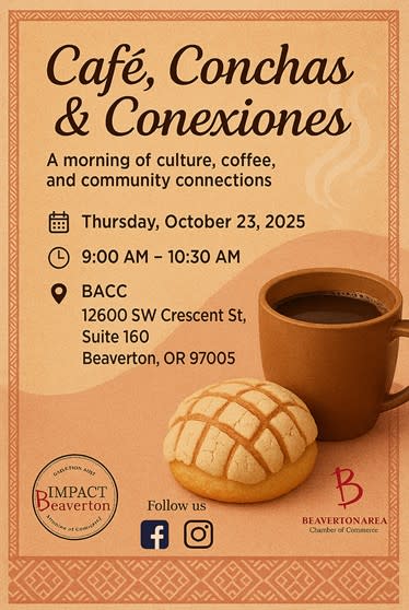 Café, Conchas & Conexiones is a relaxed morning networking event designed to bring together small business owners, entrepreneurs, and community leaders from across Beaverton and beyond. Enjoy a hot cup of coffee, traditional Mexican conchas, and genuine conversations that build real connections.