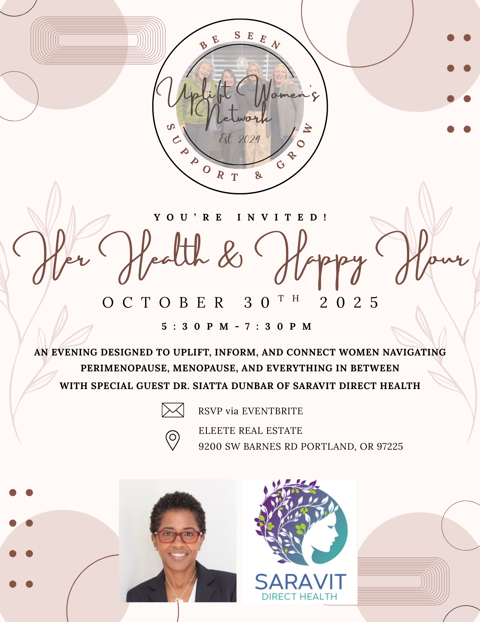 You’re Invited! 🍷 Her Health & Happy Hour – Oct 30 Join us for a fun, informative, and empowering evening all about you. Sip, share & learn! Join us for Her Health & Happy Hour—an uplifting evening focused on (peri)menopause(post), wine & women’s wellness. What to Expect: •🍷 Wine (Please bring something you'd be happy to share) + meaningful conversation •🩺 Presentation & Q&A with Dr. Siatta Dunbar (Saravit Direct Health) •💬 Real talk about perimenopause & menopause •🤝 Connection with like-minded women •💡 Tips, support, and a judgment-free vibe Let’s toast to women’s health and lift each other up.zspscr id limited to 50, so Sign Up Here!