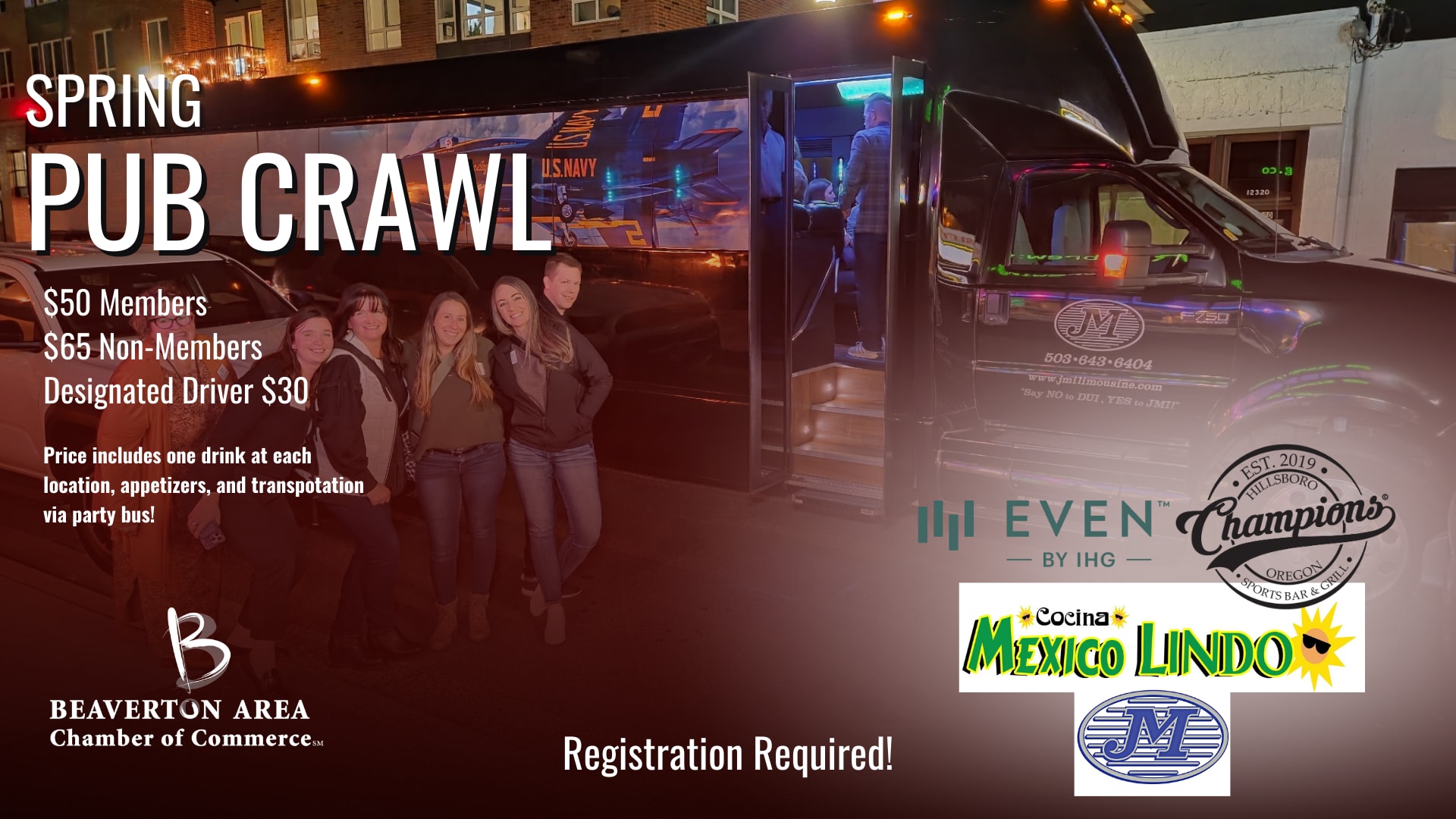 - 5:00 Gather at Even Hotel Beaverton to board the JMI Limo party bus